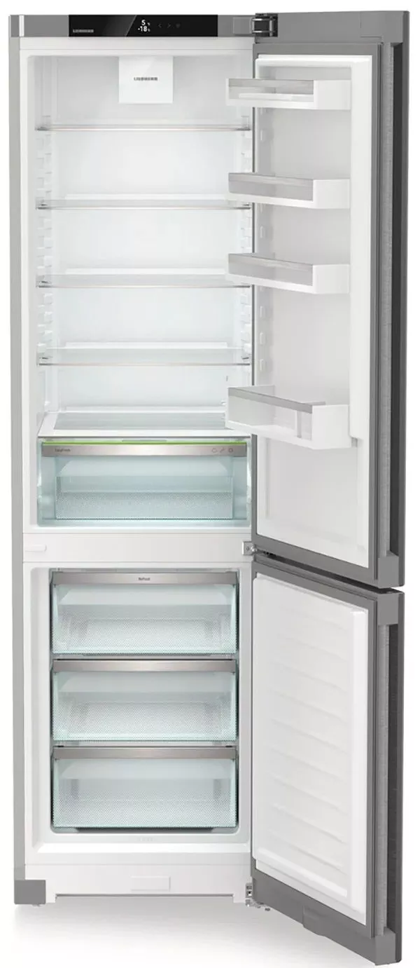 Liebherr CNsdc 5703-22 001 — двухкамерный холодильник для тех, кто ценит продуманную эргономику и аккуратный внешний вид. Поверхность SmartSteel с горизонтальной шлифовкой подчеркивает нержавеющую сталь, защищает от отпечатков и устойчивее к царапинам, а утопленная вертикальная ручка поддерживает минималистичный дизайн и удобство открывания. NoFrost в морозильном отделении избавляет от образования льда и ручного размораживания, экономя время и энергию.