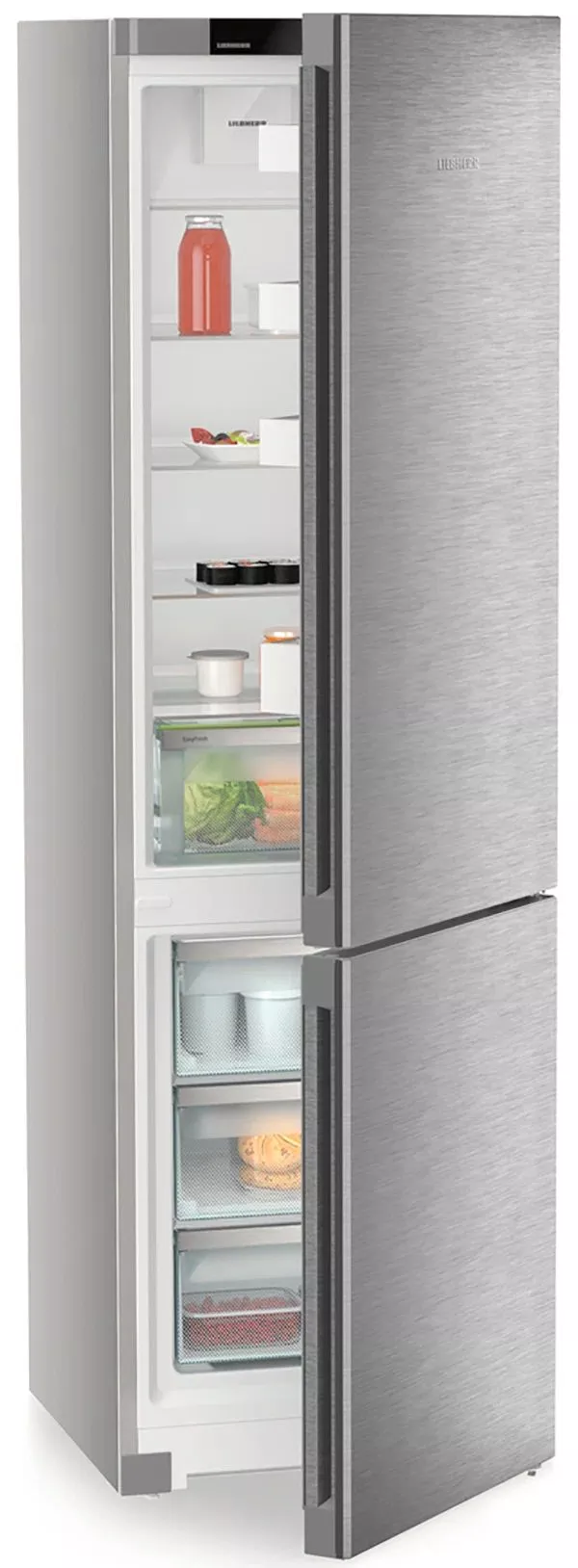 В холодильной камере предусмотрен контейнер EasyFresh: плотно закрывающийся ящик повышает влажность за счёт самих продуктов и помогает дольше сохранять их свежими. Для быстрого доступа и удобной организации пространства есть стеклянные полки с регулировкой по высоте, светодиодное потолочное освещение и продуманная дверная система хранения. DuoCooling с двумя раздельными контурами исключает обмен воздухом между камерами, предотвращая пересыхание и смешение запахов.