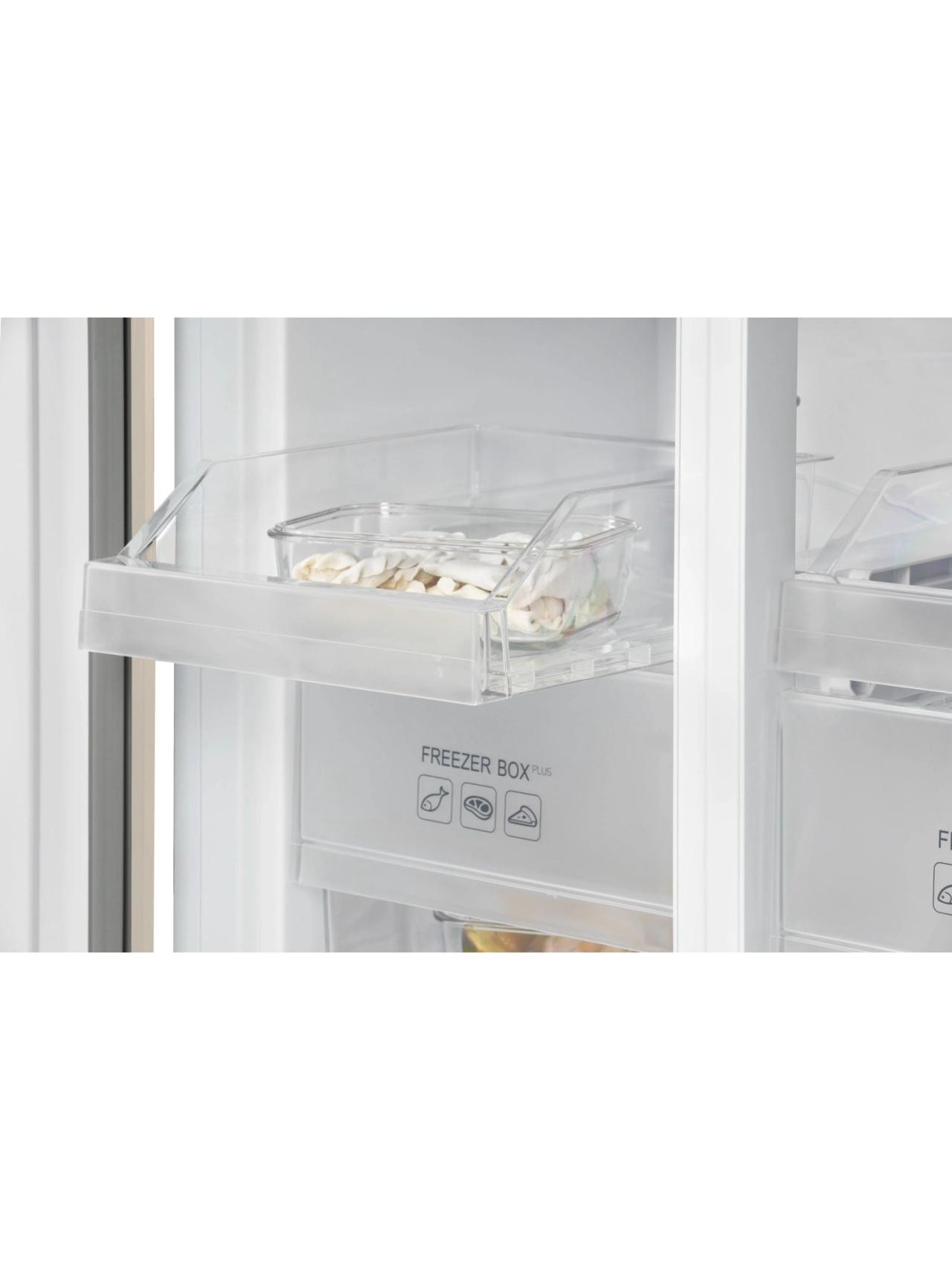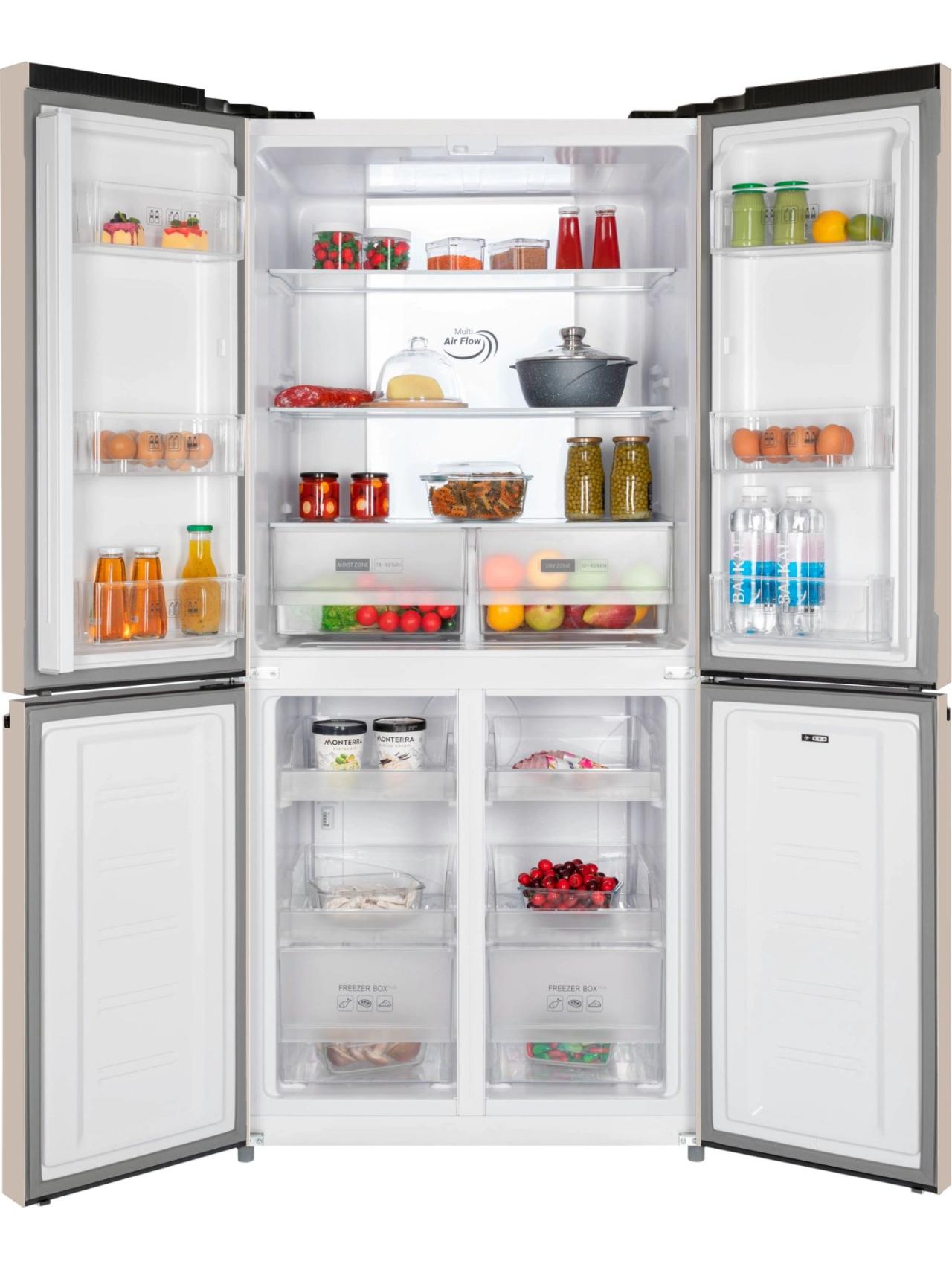 4-х дверный холодильник имеет единое пространство верхних полок холодильной камеры, чтобы удобно было размещать габаритные кастрюли и контейнеры. Прочные полки из закаленного стекла можно регулировать по высоте, а ящики в холодильной камере предназначены для хранения овощей и фруктов и оснащены влажной зоной свежести и сухой.