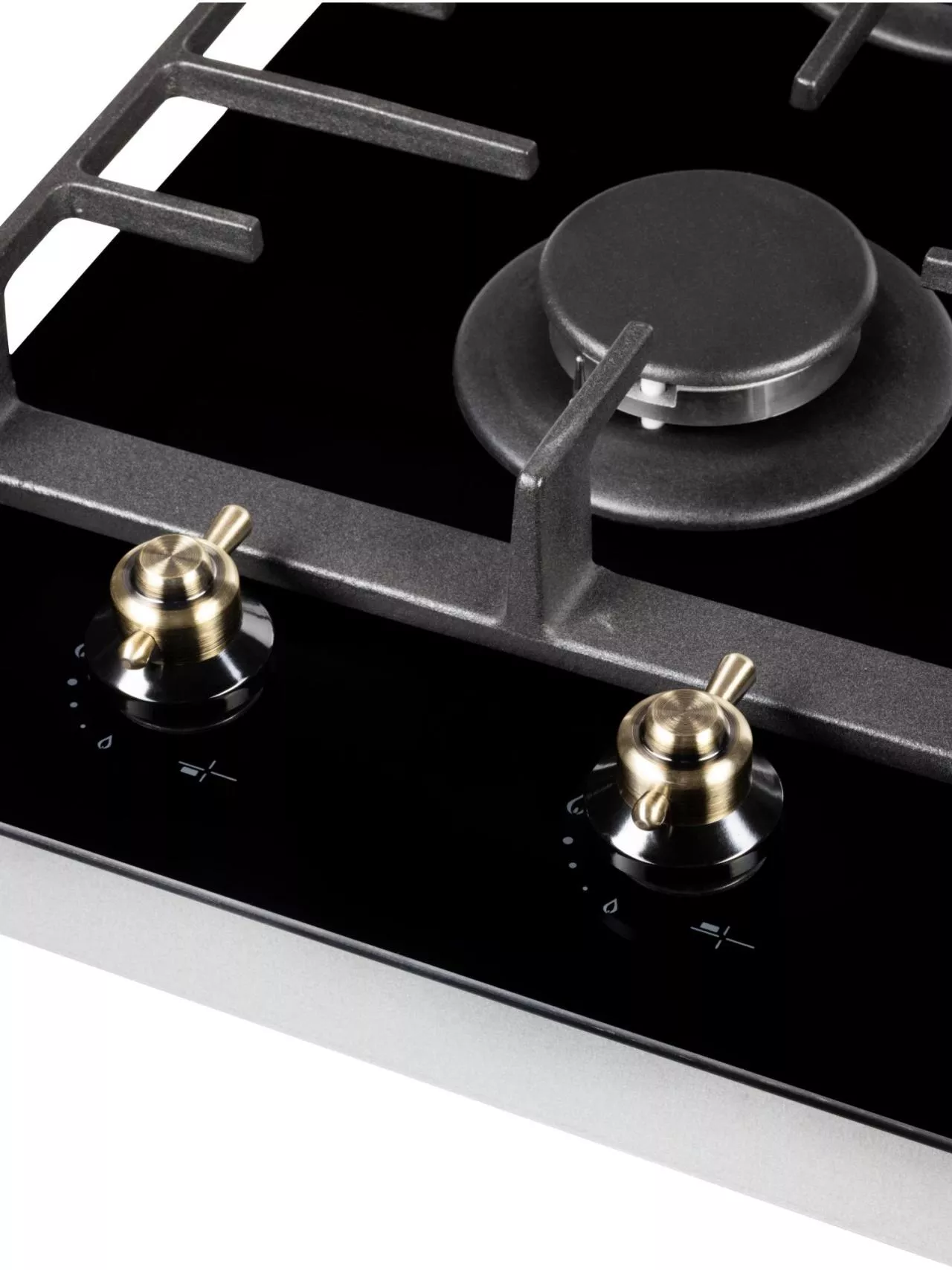 Газовая часть включает две конфорки с автоматическим розжигом от ручки и системой газ-контроля для безопасной эксплуатации. Чугунные решетки обеспечивают устойчивость посуды и рассчитаны на интенсивное использование. Наличие сенсора распознавания посуды и индикатора остаточного тепла добавляет уверенности при работе.