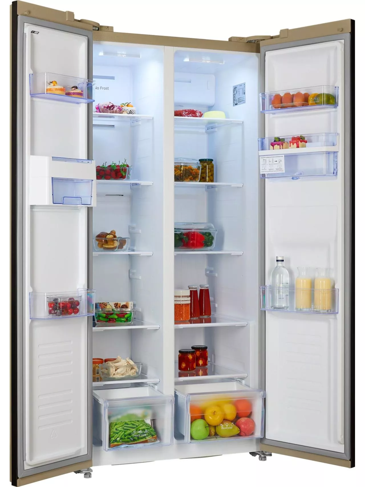 Особенность модели – наличие диспенсера для воды на фасаде двери объемом 2 литра. Такая конструкция позволяет наливать охлажденную воду, не открывая холодильник. Встроенный ледогенератор внутри морозильной камеры позволит освежиться напитками с кубиками льда.