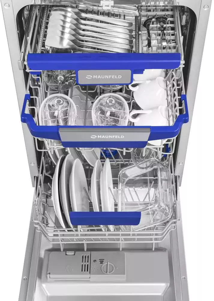 Встраиваемая посудомоечная машина MAUNFELD MLP45230 Light Beam — это узкая, но вместительная модель шириной 45 см (вместо классических 60 см). За раз она может вымыть до 10 комплектов — это оценят в больших семьях, а также те, кто любит готовить и часто принимает гостей.