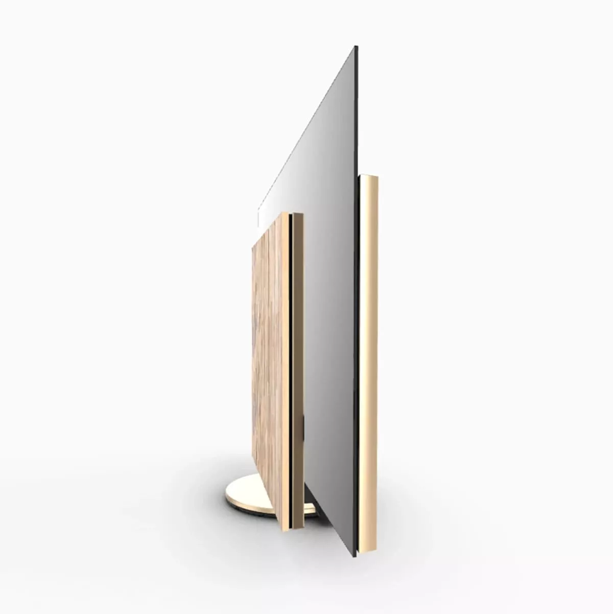 Экран телевизора в выключенном состоянии закрывает конструкция аудиосистемы. При включении экран автоматически приподнимается, а две части аудиосистемы поднимаются, как крылья бабочки, открывая экран.