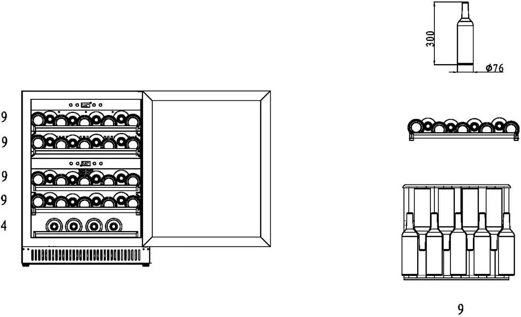 Пять съемных полок из дерева предназначены для правильного хранения вина: бутылки кладутся горизонтально (вместительность – 40 бутылок). Деревянные полки оборудованы фиксаторами от самопроизвольного выдвижения и компенсируют механические воздействия компрессора и вентилятора. Параметры холодильника задаются вручную, а также при помощи мобильного приложения «CASO-App». Возможна удаленная смена настроек из любой точки мира. Управление осуществляется при помощи двух сенсорных панелей. Регулировка температурных показателей с шагом в 1°C происходит нажатием « ∧ » и «∨». Управление внутренним освещением возможно при помощи кнопки «Свет». Встроенные светодиоды не нагреваются, и внутренний микроклимат остается максимально благоприятным для хранения бутылок.