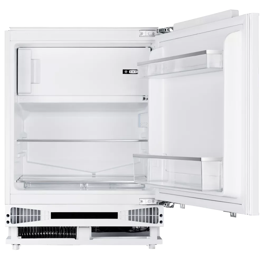 При компактных габаритах (81,8–86,8×59,6×55 см) модель предлагает продуманную организацию хранения: холодильная камера на 95 л и морозильная на 16 л. Жёсткое крепление фасада обеспечивает безупречную интеграцию в кухонный гарнитур, а уровень шума всего 40 дБ делает работу практически бесшумной.